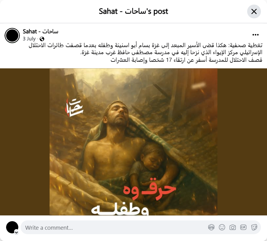 تغطية صحفية: هكذا قضى الأسير المبعد إلى غزة بسام أبو اسنينة وطفله بعدما قصفت طائرات الاحتلال الإسرائيلي مركز الإيواء الذي نزحا إليه في مدرسة مصطفى حافظ غرب مدينة غزة.