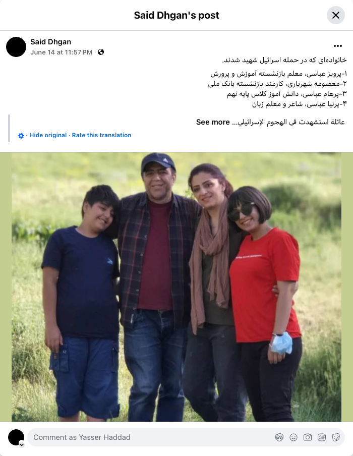 خانوادهای که در حمله اسرائیل شهید شدند.۱-پرویز عباسی، معلم بازنشسته آموزش و پرورش۲-معصومه شهریاری، کارمند بازنشسته بانک ملی۳-پرهام عباسی، دانش آموز کلاس پایه نهم۴-پرنیا عباسی، شاعر و معلم زبان عائلة استشهدت في الهجوم الإسرائيلي… See more · Hide original · Rate this translation