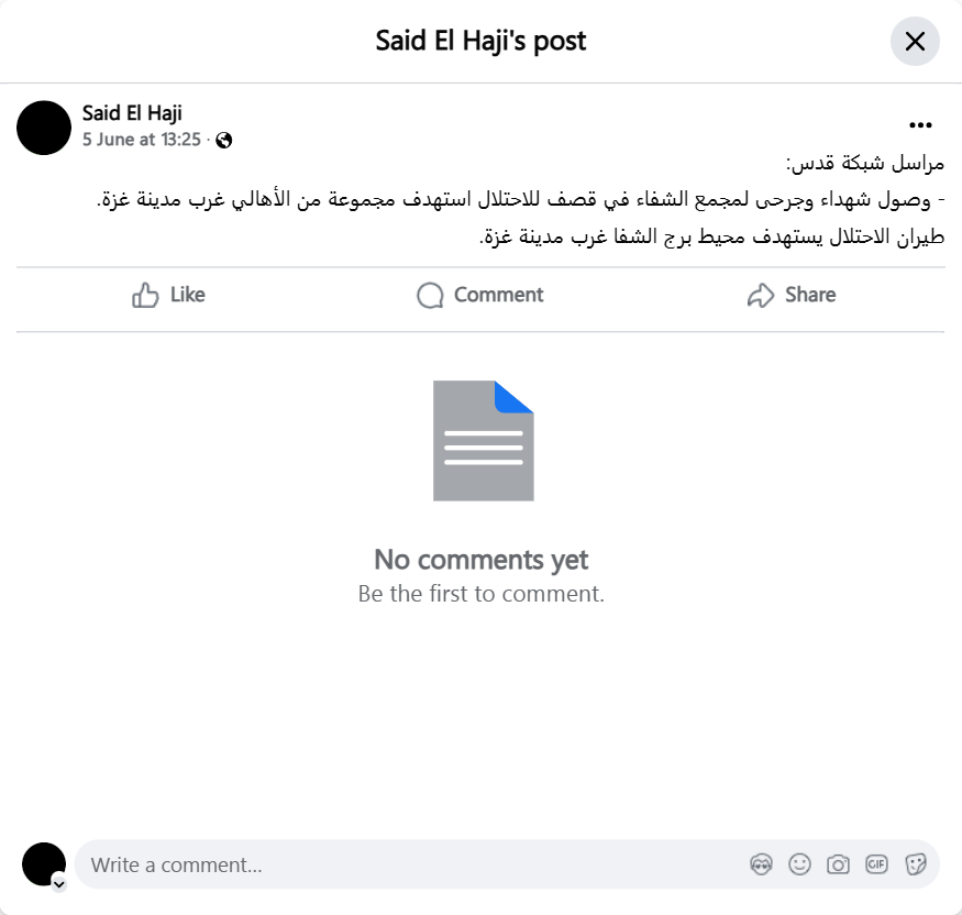 Quds Network correspondent: Martyrs and wounded arrived at Al-Shifa Hospital in an Israeli airstrike targeting a group of residents west of Gaza City. Israeli aircraft targeted the vicinity of Al-Shifa Tower west of Gaza City.