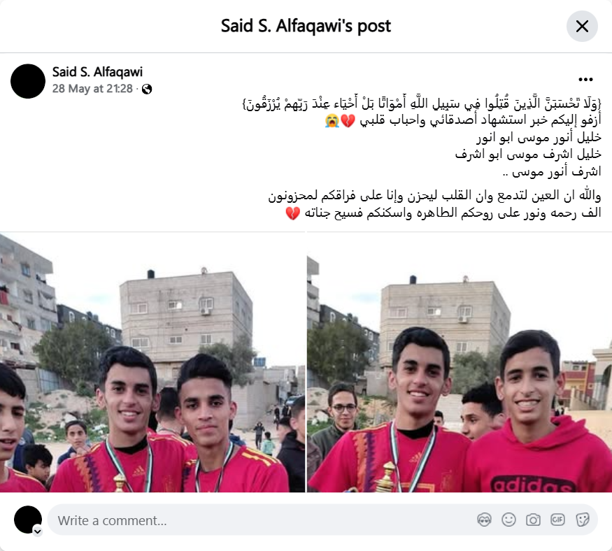 {And never think that those who were killed in the cause of Allah are dead. Rather, they are alive with their Lord, and they are provided for.} I bring you the news of the martyrdom of my friends and beloved ones, Khalil Anwar Musa Abu Anwar Khalil Ashraf Musa Abu Ashraf Ashraf Anwar Musa. By God, the eyes shed tears and the heart is saddened, and we are truly grieved by your departure. A thousand mercies and light upon your pure soul and may He grant you a spacious place in Paradise.