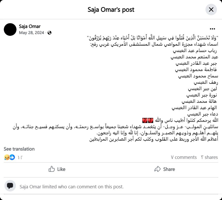 Names of the martyrs of the Mawasi massacre, north of the American Hospital, west of Rafah: