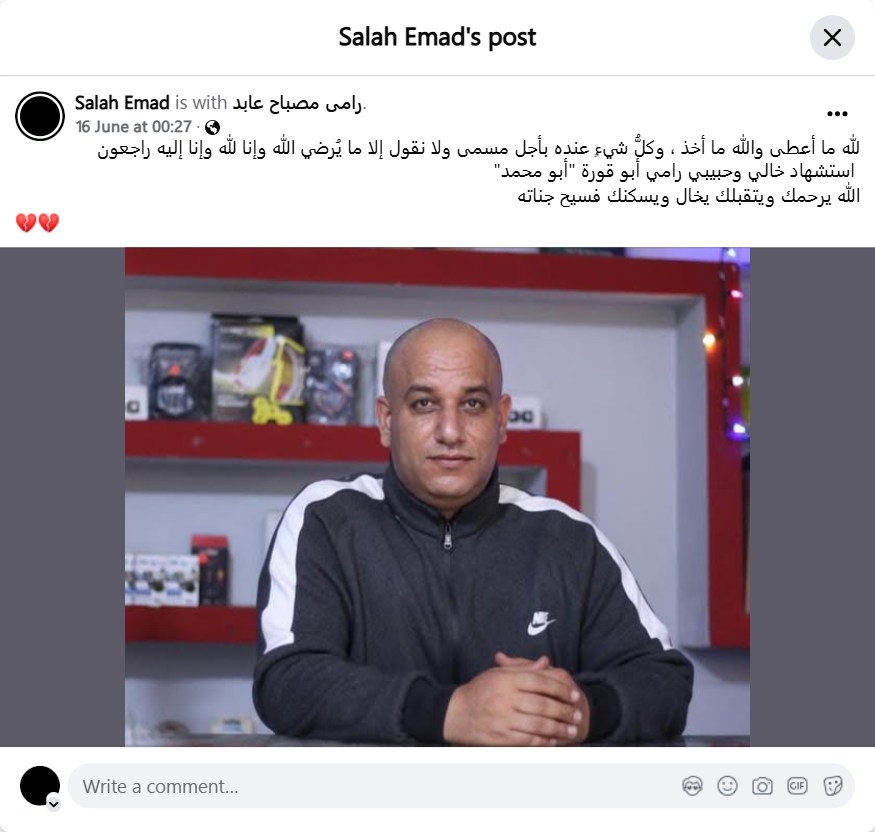 To God belongs what He gives and to God belongs what He takes, and everything with Him has an appointed term. We only say what pleases God. To God we belong and to Him we shall return. The martyrdom of my uncle and beloved Rami Abu Qura “Abu Muhammad.” May God have mercy on you and accept you, my uncle, and grant you a place in His spacious gardens.