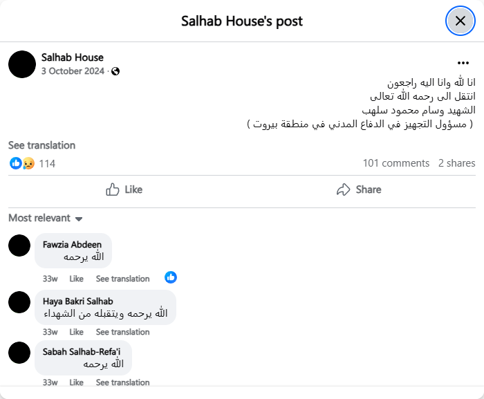 We belong to God and to Him we shall return. The martyr Wissam Mahmoud Salhab (the equipment officer in the Civil Defense in the Beirut region) has passed away to the mercy of God Almighty.