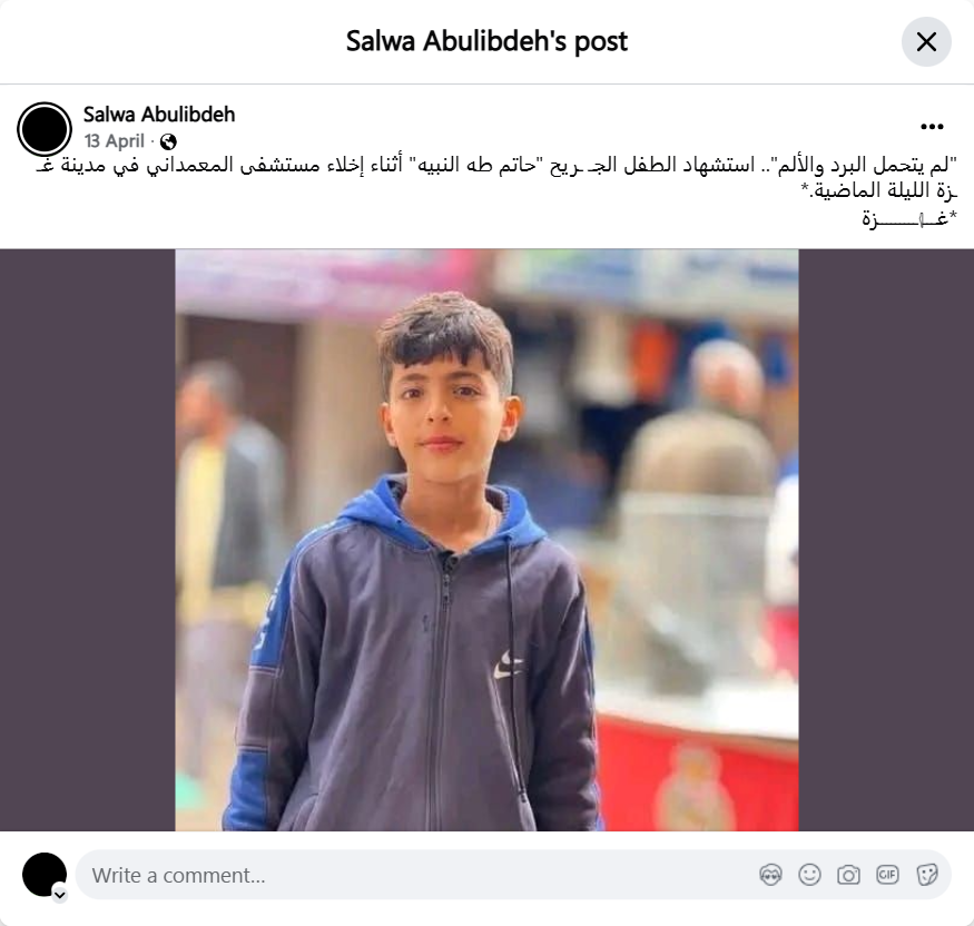"He could not bear the cold and pain." The wounded child, Hatem Taha al-Nabih, was martyred during the evacuation of the Baptist Hospital in Gaza City last night. **Gaza