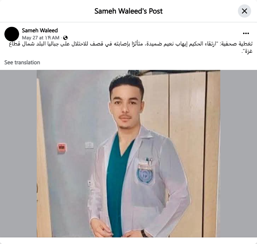 تغطية صحفية: "ارتقاء الحكيم إيهاب نعيم ضميدة، متأثرًا بإصابته في قصف للاحتلال على جباليا البلد شمال قطاع غزة".
