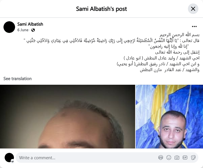 My brother, the martyr Walid Adel Al-Batsh (Abu Adel), my nephew, the martyr Nader Rafiq Al-Batsh (Abu Yahya), and the martyr Abdul Qader Mazen Al-Batsh have passed away to the mercy of God Almighty.