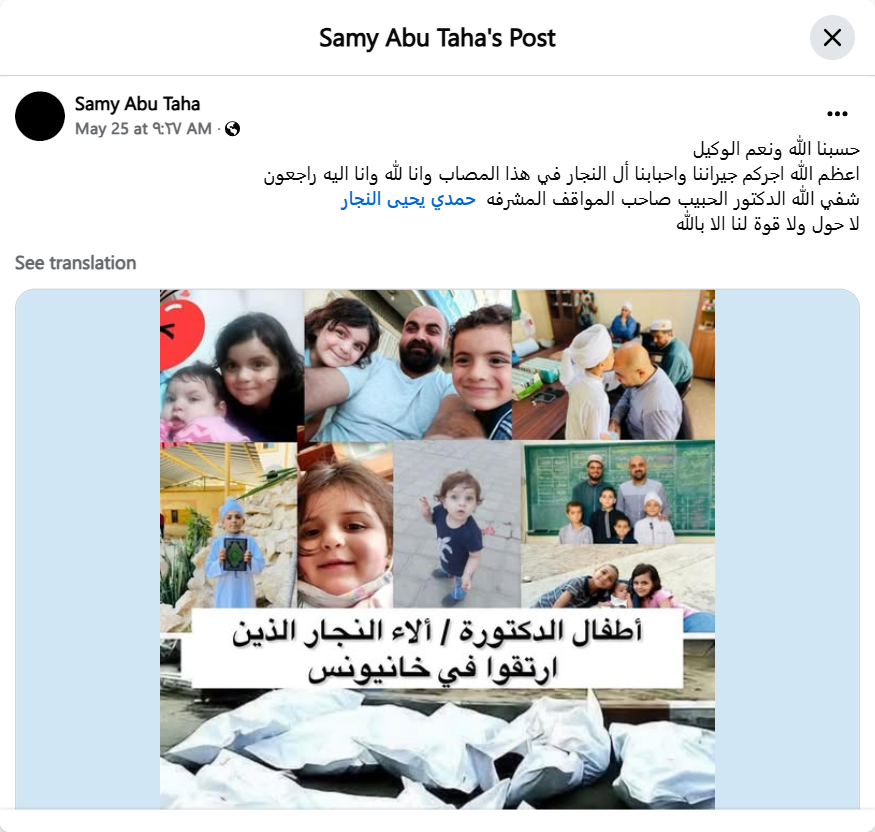 God is sufficient for us, and He is the best Disposer of affairs. May God grant you the greatest reward, our neighbors and loved ones, the Al-Najjar family, for this affliction. To God we belong and to Him we shall return. May God heal the beloved doctor, the owner of honorable positions, Hamdi Yahya Al-Najjar. We have no power or strength except with God.