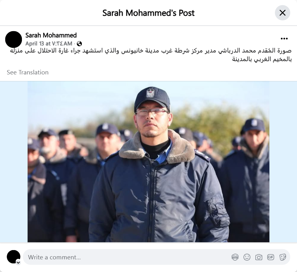 A photo of Lieutenant Colonel Mohammed Al-Darbashi, director of the West Khan Yunis Police Station, who was martyred as a result of an Israeli airstrike on his home in the city's western camp.