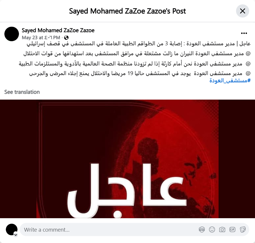 Urgent | Director of Al-Awda Hospital: Three medical staff members working at the hospital were injured in an Israeli attack.