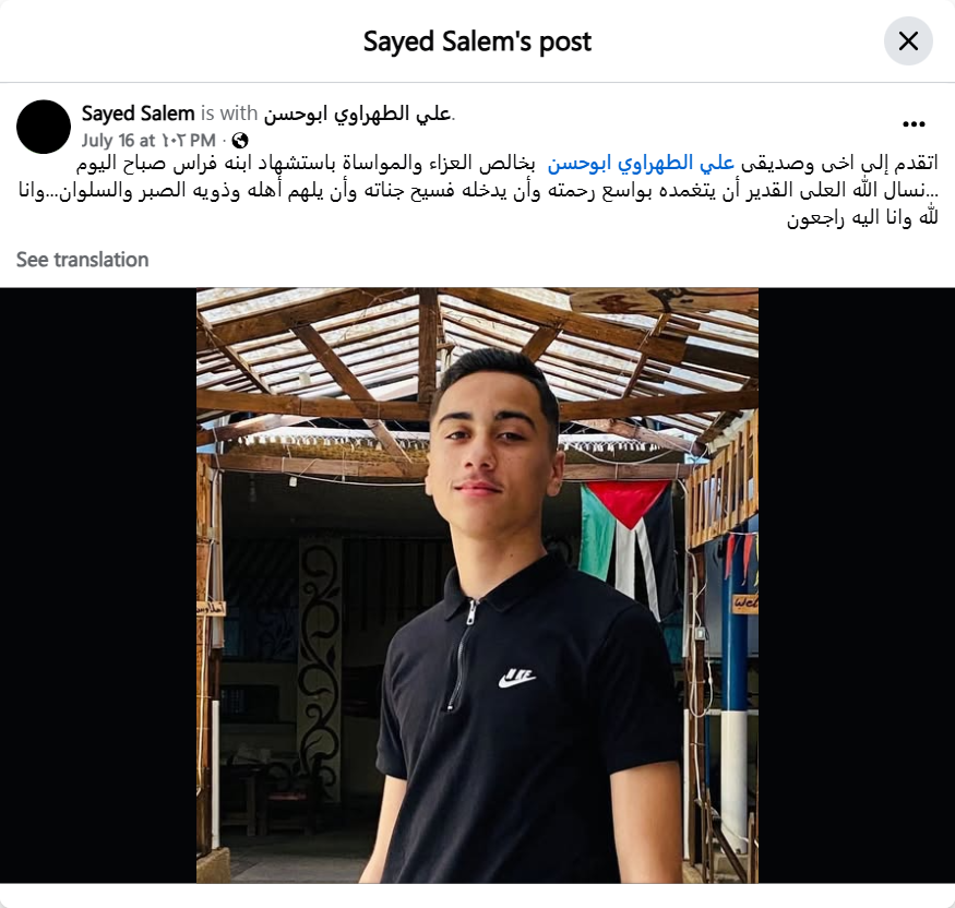 I offer my sincere condolences to my brother and friend Ali Al-Tahrawi Abu Hassan on the martyrdom of his son Firas this morning... We ask God Almighty to have mercy on him and to admit him into His spacious gardens and to inspire his family and relatives with patience.