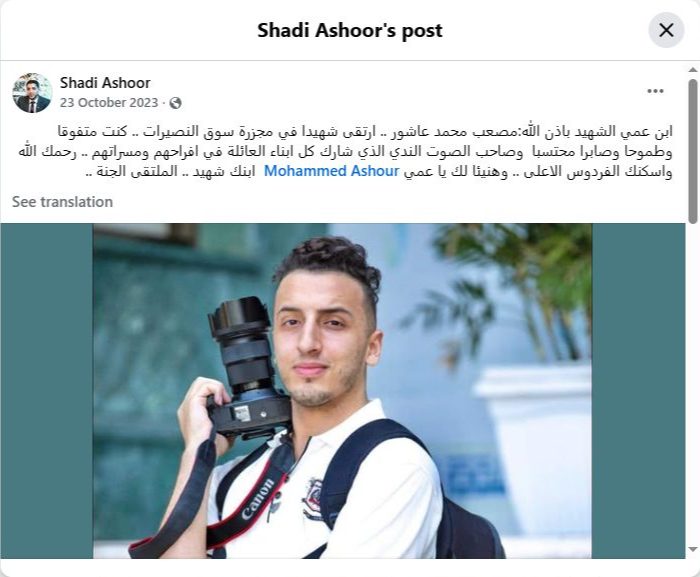 My cousin, the martyr, God willing: Musab Muhammad Ashour... He was martyred in the massacre at the Nuseirat market... You were outstanding, ambitious, patient, and steadfast, and you had a melodious voice that shared in the joys and celebrations of all the family members... May God have mercy on you and grant you the highest Paradise... And congratulations to you, Uncle Mohammed Ashour, your son is a martyr... We will meet in Paradise.