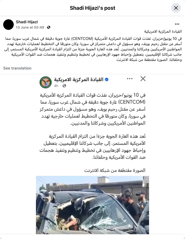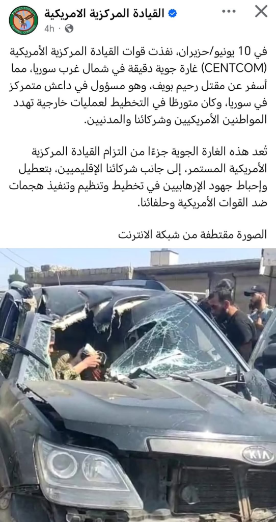 القيادة المركزية الامريكيةفي 10 يونيو/حزيران، نفذت قوات القيادة المركزية الأمريكية (CENTCOM) غارة جوية دقيقة في شمال غرب سوريا، مما أسفر عن مقتل رحيم بويف، وهو مسؤول في داعش متمركز في سوريا، وكان متورطًا في التخطيط لعمليات خارجية تهدد المواطنين الأمريكيين وشركائنا والمدنيين. تُعد هذه الغارة الجوية جزءًا من التزام القيادة المركزية الأمريكية المستمر، إلى جانب شركائنا الإقليميين، بتعطيل وإحباط جهود الإرهابيين في تخطيط وتنظيم وتنفيذ هجمات ضد القوات الأمريكية وحلفائنا. الصورة مقتطفة من شبكة الانترنت