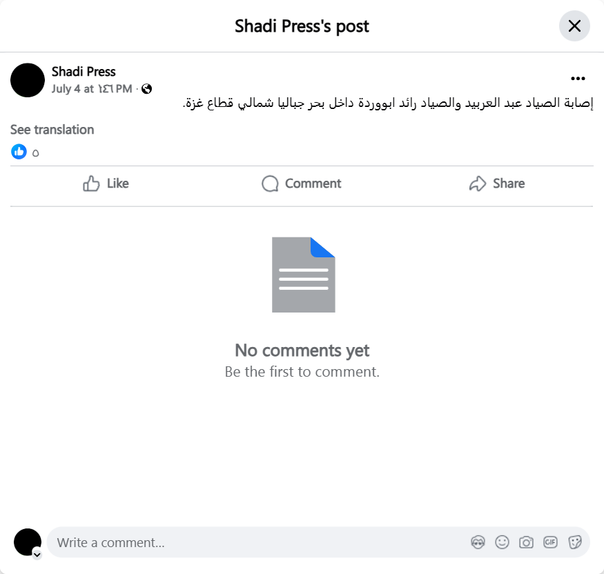Fishermen Abdul Arabid and Raed Abu Warda were injured in the Jabalia sea, north of the Gaza Strip.