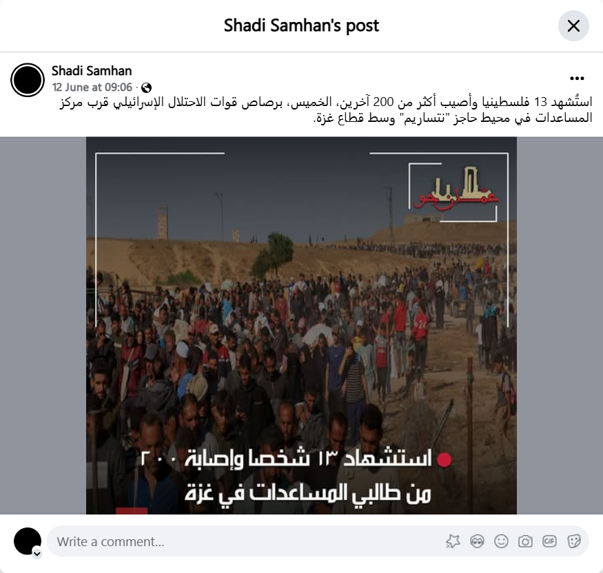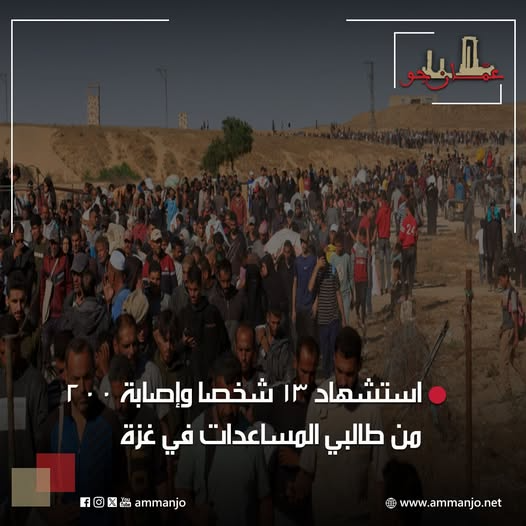 Thirteen Palestinians were killed and more than 200 others injured on Thursday by Israeli occupation forces near the aid center near the Netzarim checkpoint in the central Gaza Strip.