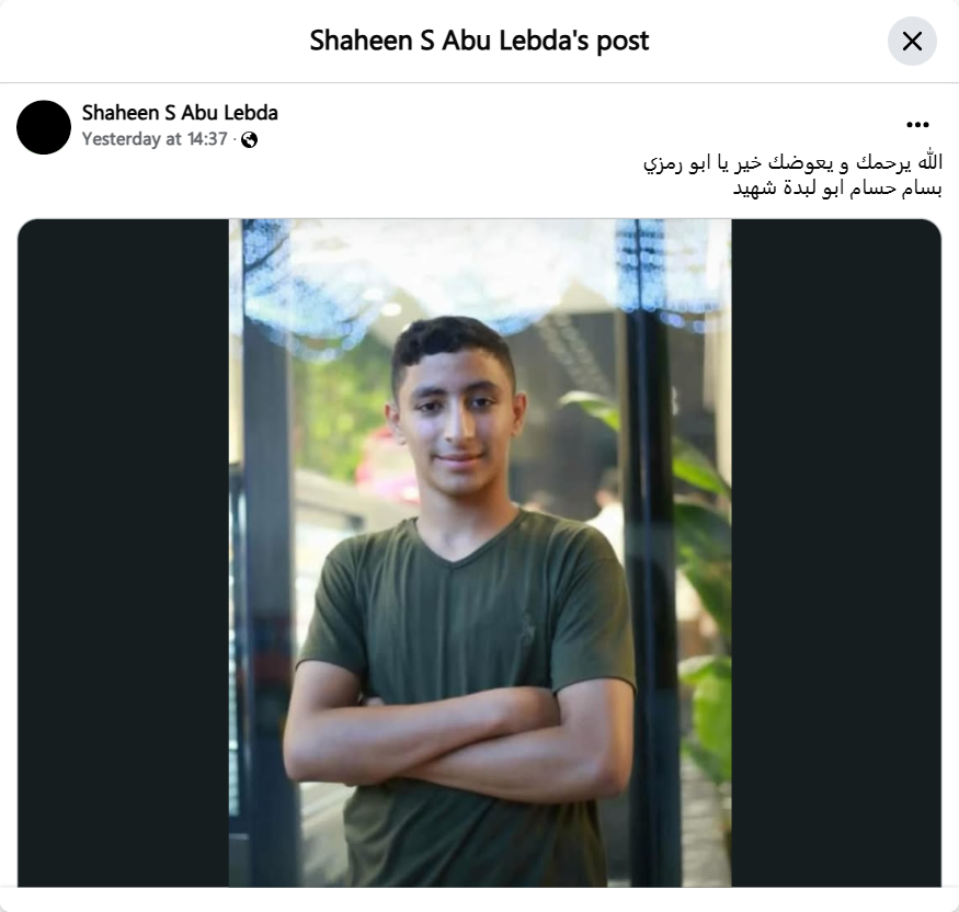 May God have mercy on you and compensate you with something better, Abu Ramzi Bassam Hussam Abu Labdeh, a martyr, my dear brother, close to my heart, a martyr. My pride in your martyrdom, my brother, is indescribable!! Praise be to God who chose from us martyrs in the way of God and seeking His pleasure, in sacrifice for Jerusalem and Palestine. May God have mercy on you, my brother. May God have mercy on you and grant you the highest paradise.