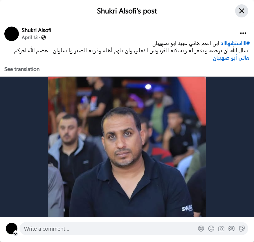 #Martyrdom of our cousin Hani Obaid Abu Suhaiban. We ask God to have mercy on him, forgive him, and grant him the highest paradise, and to inspire his family and relatives with patience and solace... May God reward you greatly.