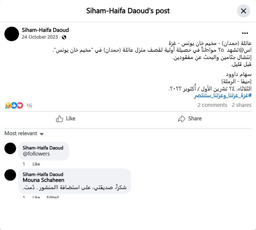 (Hamdan) family - Khan Yunis camp - GazaAS@ 25 citizens are killed in the initial toll of the bombing of the (Hamdan) family home in "Khan Yunis camp." Bodies are being recovered and missing persons are being searched for. A short while ago. Siham Daoud [Haifa - Ramla] Tuesday, October 24, 2023. #Gaza_is_our_Gaza_and_our_pride_will_win