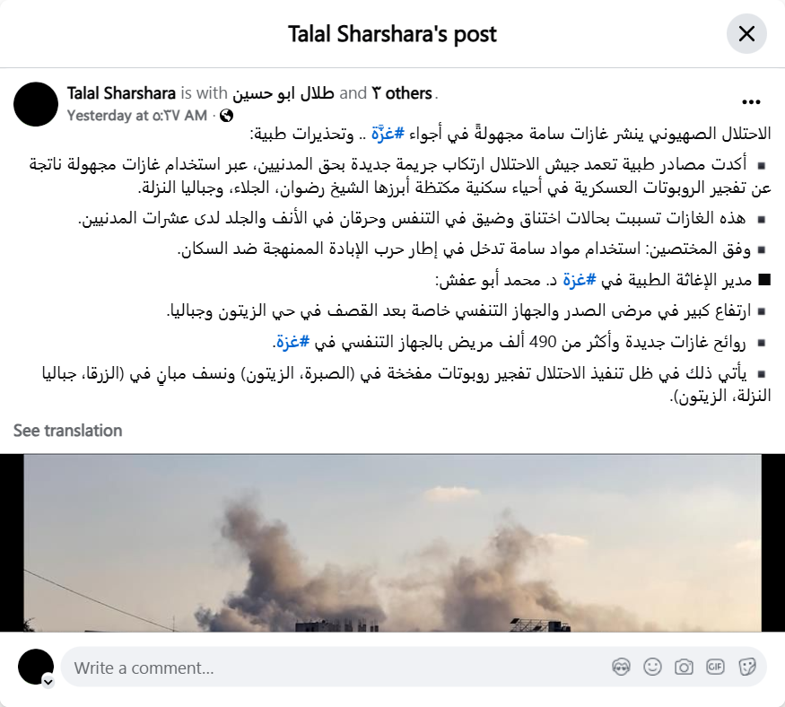 الاحتلال الصهيوني ينشر غازات سامة مجهولةً في أجواء #غزَّة .. وتحذيرات طبية: