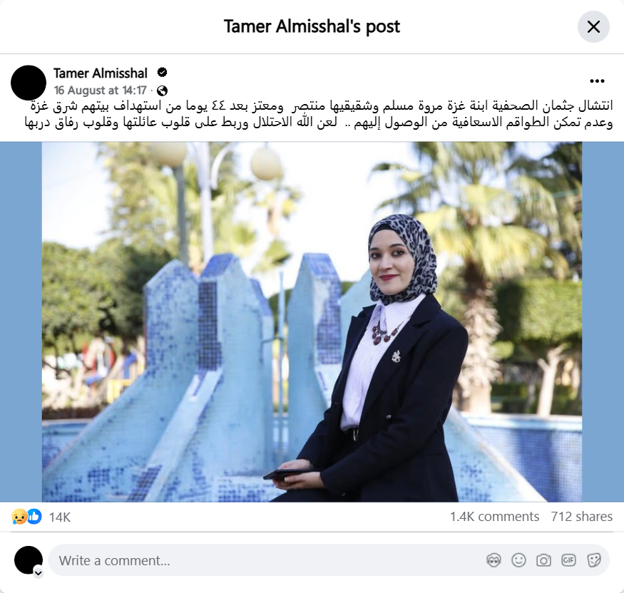 The bodies of Gaza journalist Marwa Muslim and her two brothers, Muntaser and Moataz, were recovered 44 days after their home was targeted in eastern Gaza and ambulance crews were unable to reach them. May God curse the occupation and comfort the hearts of her family and her comrades.