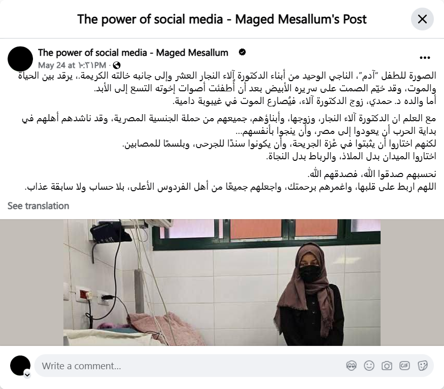 The photo is of the child “Adam”, the only survivor of Dr. Alaa Al-Najjar’s ten children, and beside him is his honorable aunt. He lies between life and death, silence has fallen over his white bed after the voices of his nine siblings were extinguished forever. As for his father, Dr. Hamdi, Dr. Alaa’s husband, he is fighting death in a bloody coma. It is worth noting that Dr. Alaa Al-Najjar, her husband, and their children are all Egyptian citizens, and their families had pleaded with them at the beginning of the war to return to Egypt and save themselves… but they chose to stand firm in the dignity of the wounded, to support the wounded, and to be a balm for the injured. They chose the battlefield instead of refuge, and steadfastness instead of survival. We believe that they were truthful to God, and God was truthful with them. O God, comfort her heart, immerse them in Your mercy, and make them all among the people of the highest paradise, without reckoning or previous torment.