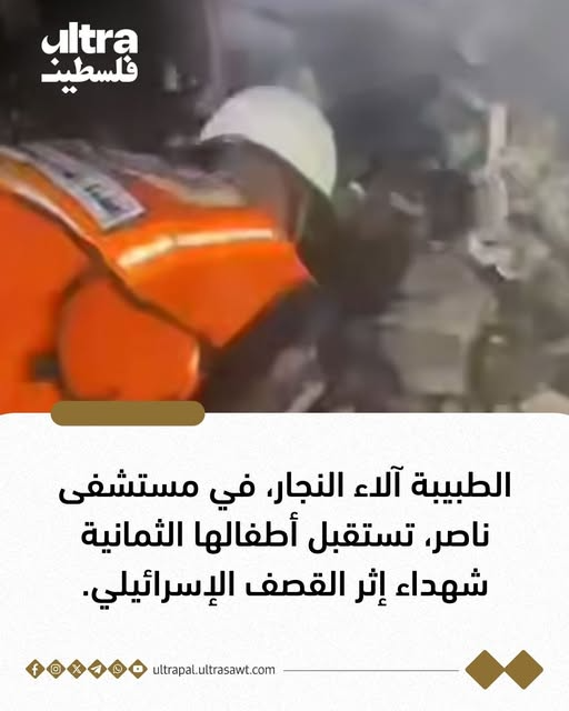 بحسب ما نشره "مستشفى ناصر" في خانيونس جنوب قطاع غزة، فإنّ طبيبة الأطفال التي تعمل في المستشفى، آلاء النجار، فوجئت بوصول أطفالها الثمانية "أشـ.ـلاء" و"مُـتـفَحّـ.ـمـ.ـيـن" جرّاء القصف الإسرائيلي.