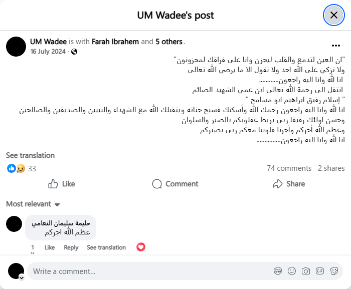 My cousin, the martyr and fasting person, "Islam Rafiq Ibrahim Abu Musameh," has passed away.