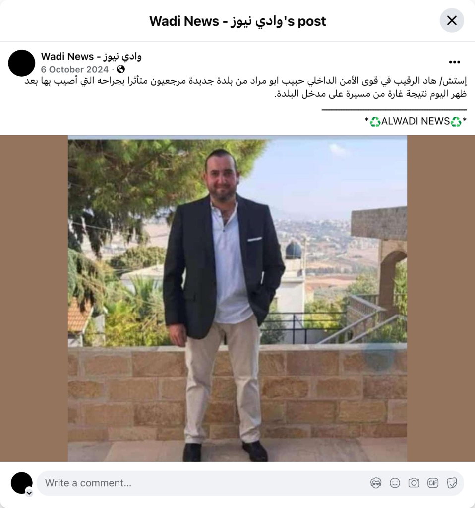 إستش/ هاد الرقيب في قوى الأمن الداخلي حبيب ابو مراد من بلدة جديدة مرجعيون متأثرا بجراحه التي أصيب بها بعد ظهر اليوم نتيجة غارة من مسيرة على مدخل البلدة.