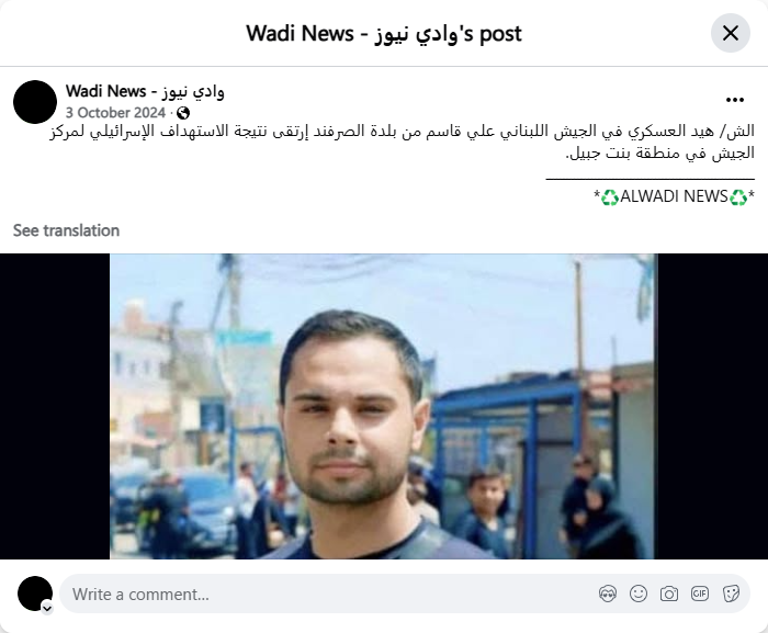 الش/ هيد العسكري في الجيش اللبناني علي قاسم من بلدة الصرفند إرتقى نتيجة الاستهداف الإسرائيلي لمركز الجيش في منطقة بنت جبيل.