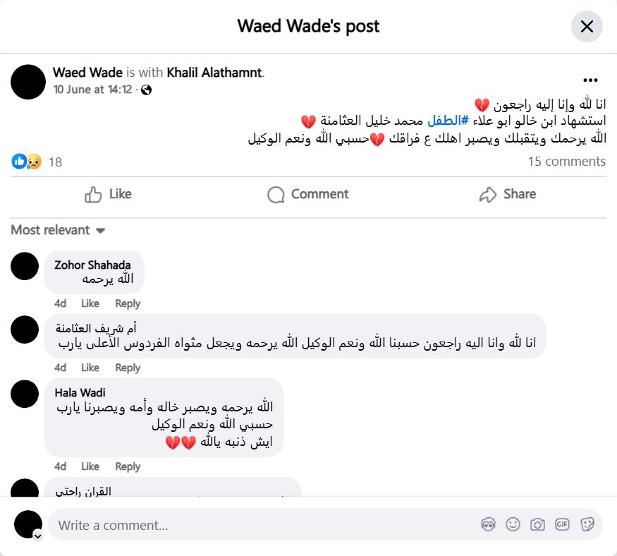 We belong to Allah and to Him we shall return. The martyrdom of Abu Alaa’s cousin, the child Muhammad Khalil Al-Athamneh. May Allah have mercy on you and accept you and grant your family patience over your loss. Allah is sufficient for me, and He is the best Disposer of affairs.