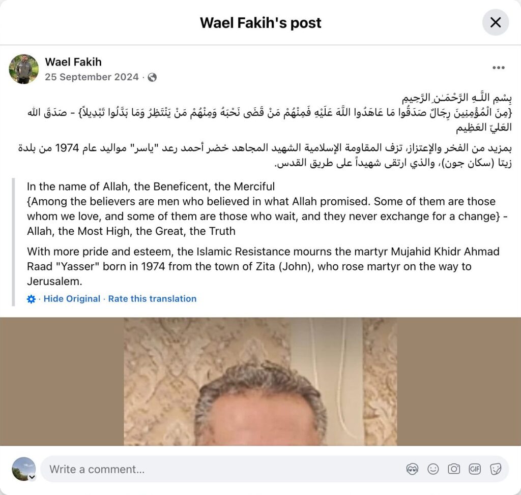 Archive URL: https://airwars.org/source/www-facebook-com-wael-fakih-pfbid0dvx98tvpeyrkevyj5a9fjgwdpv84omkhdgttmemcfjtpb6cjm8fkjcox9unjky5ul-2024-09-25-110000/