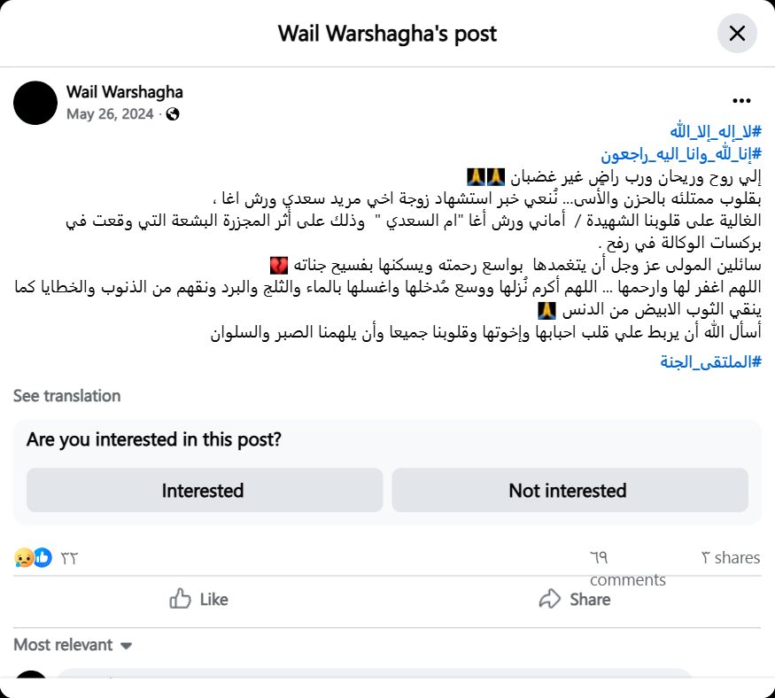 With_hearts_filled_with_sadness_and_grief... We announce the martyrdom of my brother Mourid Saadi Warsh Agha's wife,