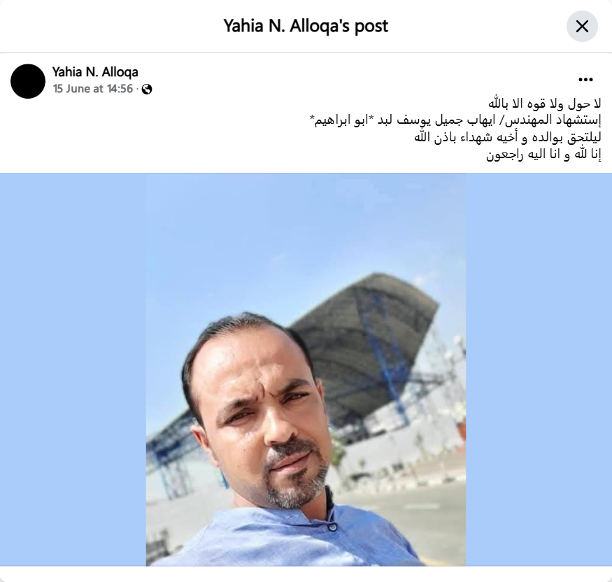 There is no power nor strength save with God. The engineer/ Ihab Jamil Yousef Labad *Abu Ibrahim* was martyred. He joined his father and brother as martyrs, God willing. To God we belong and to Him we shall return.