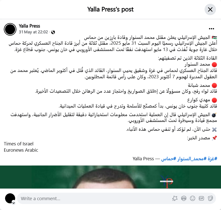 The Israeli army announces the killing of Mohammed Sinwar and other senior Hamas leaders. The Israeli army officially announced on Saturday, May 31, 2025, the killing of three prominent leaders of Hamas's military wing during an airstrike carried out on May 13 targeting a tunnel under the European Hospital in Khan Yunis, in the southern Gaza Strip. The three leaders who were eliminated were: Mohammed Sinwar, the leader of Hamas's military wing in Gaza and the brother of Yahya Sinwar, the commander killed last October. Mohammed is considered one of the masterminds of the October 7, 2023 attack and was at the top of the wanted list. Mohammed Shabaneh, the commander of the Rafah Brigade, was responsible for launching rockets and holding several hostages during the recent escalation. Mahdi Kawar, the commander of the southern Khan Yunis battalion, began as an arms manufacturer and rose to command field operations. The Israeli army said the operation used accurate intelligence to minimize collateral damage and targeted a command and control complex under the European Hospital. Hamas has yet to confirm or deny this report. News source: Times of Israel Euronews Arabic #Gaza #Mohammed_Sinwar #Hamas — Yalla Press