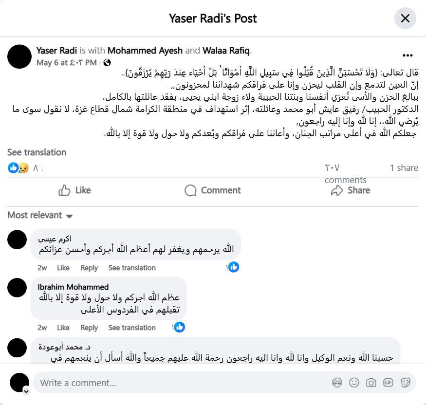 Allah the Almighty said: {And never think that those who have been killed in the cause of Allah are dead. Rather, they are alive with their Lord, and they are provided for.} The eyes shed tears, the heart is grieved, and we are truly saddened by your departure, our martyrs. With deep sorrow and grief, we offer our condolences to ourselves and our beloved daughter Walaa, the wife of my son Yahya, for the loss of her entire family, the beloved Dr. Rafeeq Ayesh Abu Muhammad and his family, as a result of an attack in the Al-Karama area, north of the Gaza Strip. We say only what pleases Allah. To Allah we belong and to Him we shall return. May Allah place you in the highest ranks of Paradise and help us with your departure and absence. There is no power or strength except with Allah.