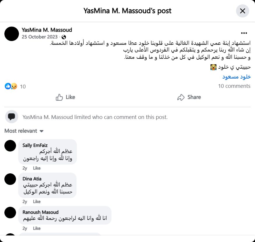 The martyrdom of my dear cousin, the martyr Kholoud Atta Masoud, and her five children. May God have mercy on you and accept you into the highest paradise, God willing. God is sufficient for us, and He is the best Disposer of affairs for all those who let us down and did not stand with us. My beloved Kholoud