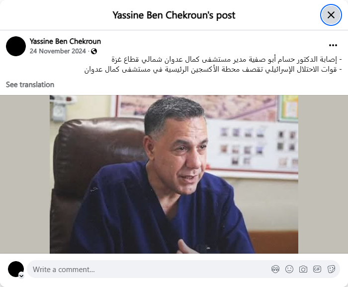 - Dr. Hussam Abu Safiya, director of Kamal Adwan Hospital in the northern Gaza Strip, was injured. - Israeli occupation forces bombed the main oxygen station at Kamal Adwan Hospital.