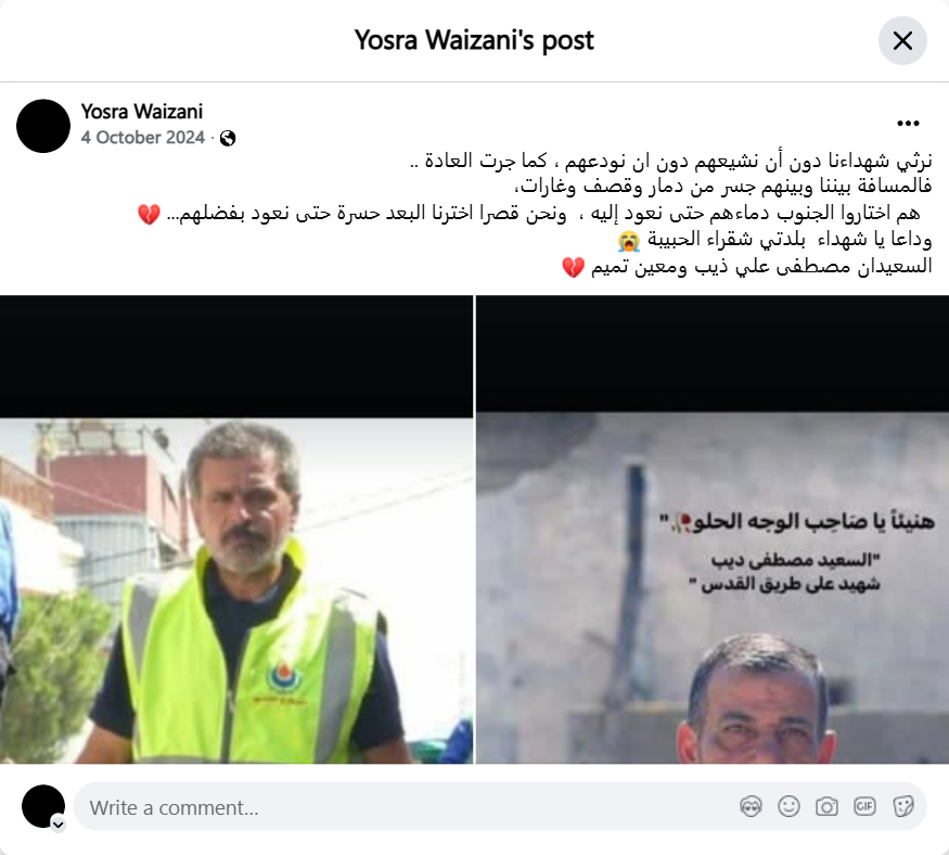 Archive URL: https://airwars.org/source/www-facebook-com-yosra-waizani-pfbid04gkzgvv3wacrsgqfdc4jexmlfe5xcibay5kckzqaldtpxucynmqgo2e7vqd7gt4ml-2024-10-04-090000-2/