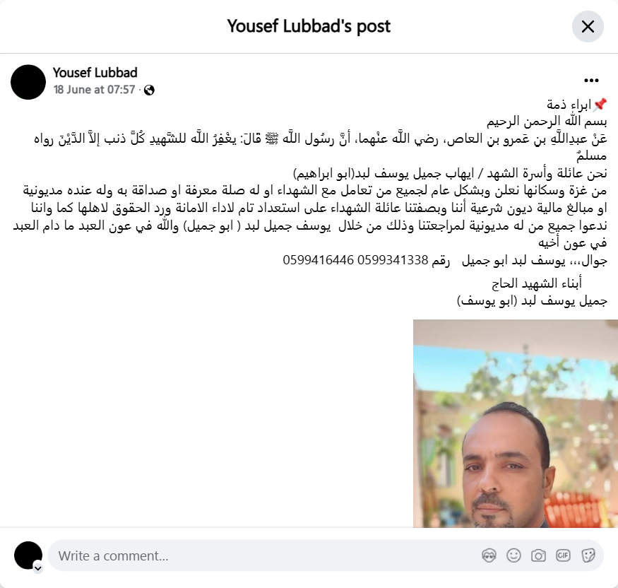 Discharge of responsibility In the name of God, the Most Gracious, the Most Merciful On the authority of Abdullah bin Amr bin Al-Aas, may God be pleased with them, that the Messenger of God, may God bless him and grant him peace, said: God forgives the martyr every sin except debt. Narrated by Muslim We, the family and household of the martyr / Ihab Jamil Yousef Labad (Abu Ibrahim) from Gaza and its residents, announce in general to all who dealt with the martyrs or have a relationship of acquaintance or friendship with him and who has a debt or financial amounts of legitimate debts that we, in our capacity as the family of the martyrs, are fully prepared to fulfill the trust and return rights to their owners. We also call on all who have a debt to refer to us through Yousef Jamil Labad (Abu Jamil). God helps the servant as long as the servant helps his brother. Mobile,,, Yousef Labad Abu Jamil Number 0599341338 0599416446 Sons of the martyr Hajj Jamil Yousef Labad (Abu Yusuf)