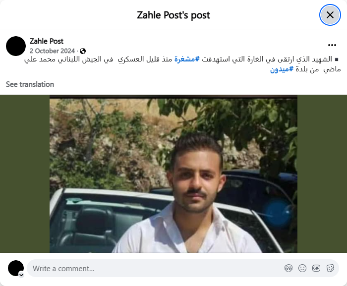 The martyr who was killed in the raid that targeted #Mashghara a short while ago is the Lebanese army soldier, Muhammad Ali Madi, from the town of #Maidoun.