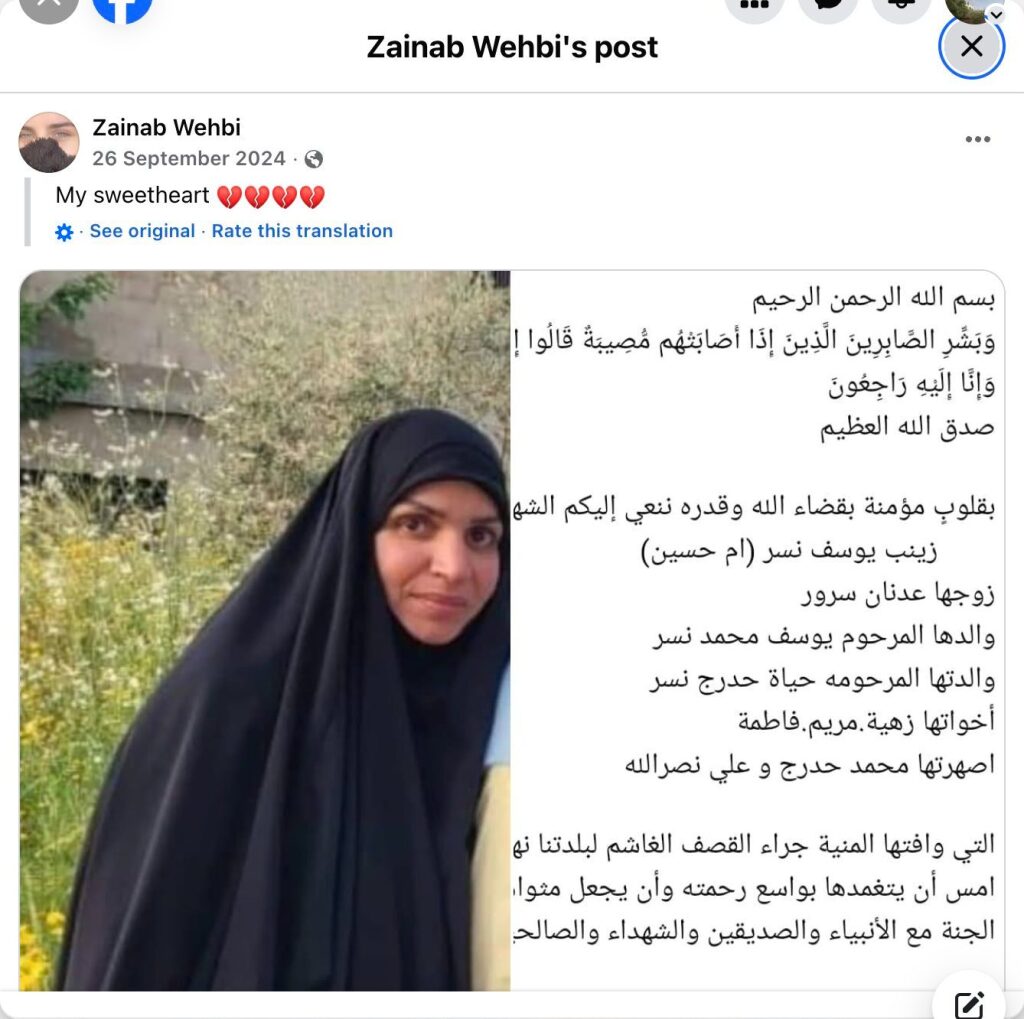 My dearest, with profound sorrow, grief, and pride, we mourn the martyrdom of Zeinab Youssef Nasr
