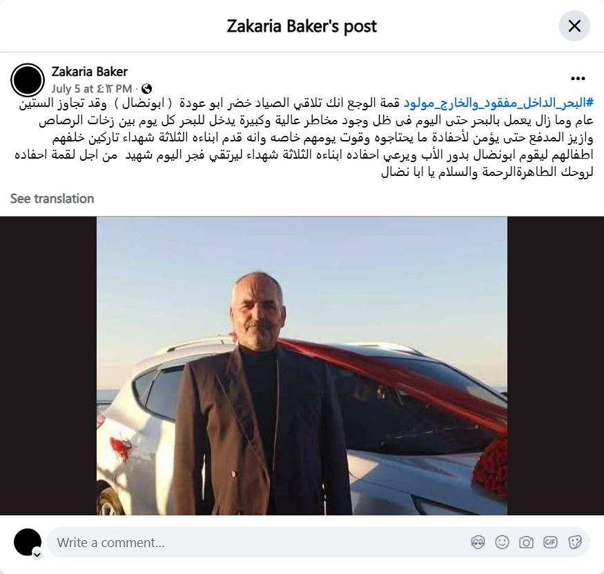 #The_inside_sea_is_missing_and_outside_is_born The height of pain is when you find the fisherman Khader Abu Odeh (Abu Nidal) who is over sixty years old and still works at sea until today in the presence of great and great risks. He enters the sea every day amidst showers of bullets and the roar of the cannon to secure for his grandchildren what they need and their daily sustenance, especially since he presented his three sons as martyrs, leaving behind their children for Abu Nidal to play the role of the father and take care of his grandchildren. His three sons were martyrs, so that he ascended at dawn today as a martyr for the sake of his grandchildren’s livelihood. To your pure soul, mercy and peace, Abu Nidal