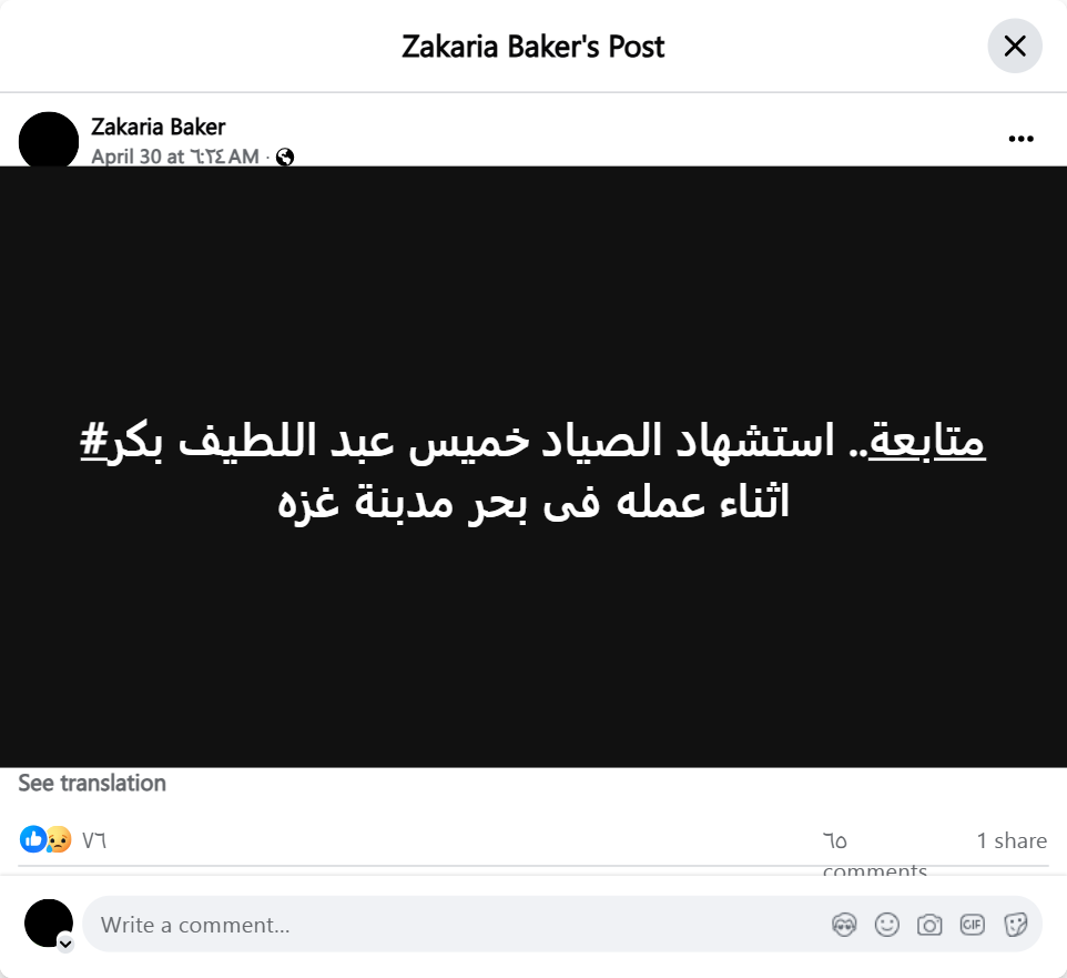 #Follow-up.. Fisherman Khamis Abdul Latif Bakr was martyred while working in the sea of Gaza City.