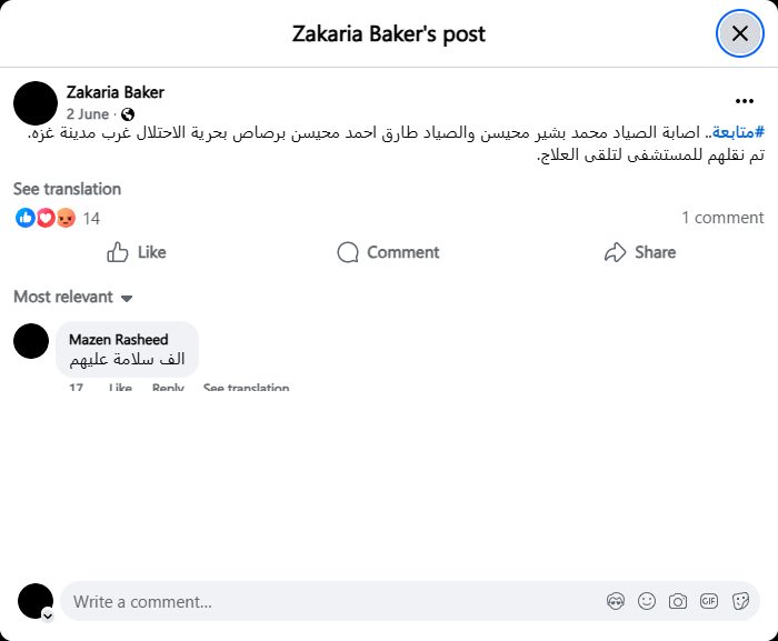 #Follow-up.. Fisherman Mohammed Bashir Muhaisen and fisherman Tariq Ahmed Muhaisen were injured by Israeli naval gunfire west of Gaza City. They were taken to the hospital for treatment.