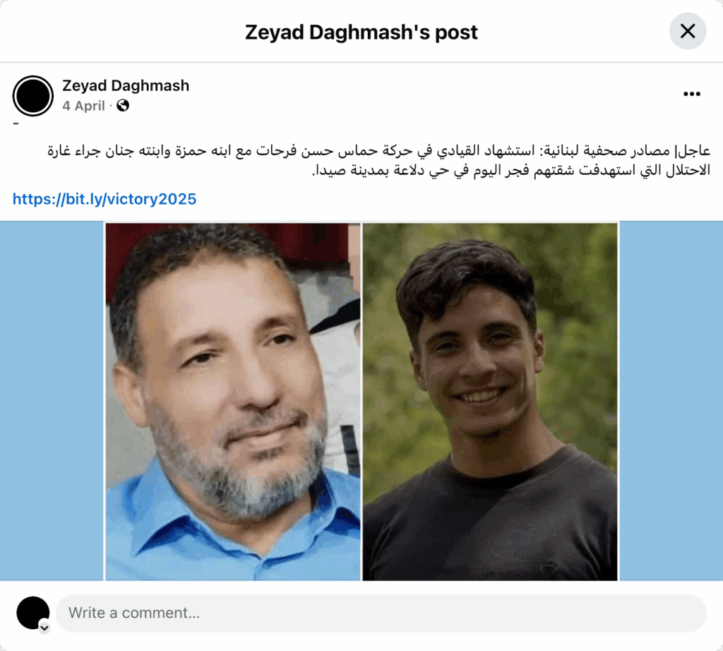 -Urgent | Lebanese press sources: Hamas leader Hassan Farhat was martyred along with his son Hamza and daughter Janan as a result of an Israeli airstrike that targeted their apartment at dawn today in the Dala'a neighborhood of Sidon. https://bit.ly/victory2025