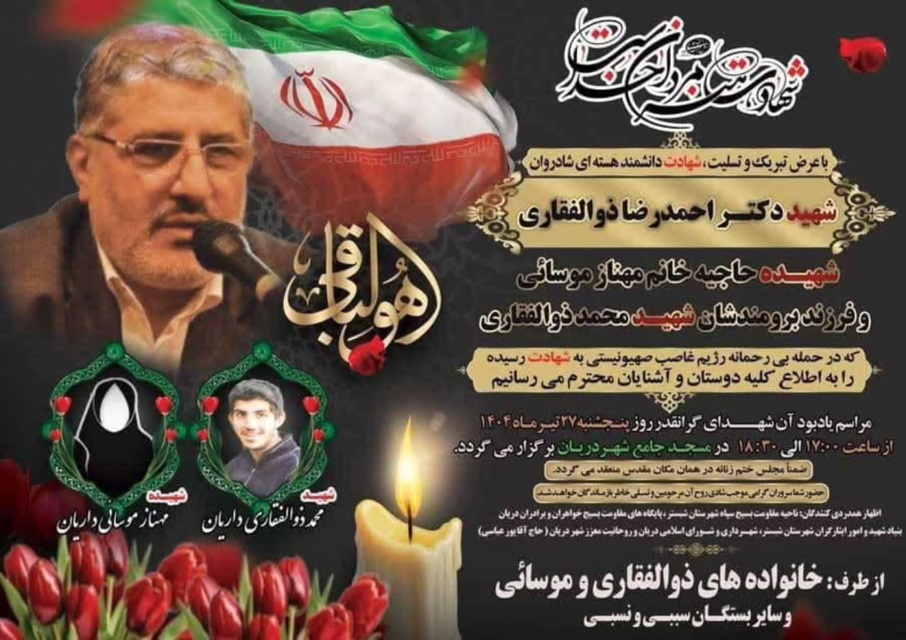 Dear friends and acquaintances, we inform you that the memorial ceremony of those precious martyrs will be held on Thursday, 26 Tir month 1404 from 5:00 PM to 6:30 PM at the Grand Mosque in the city of Daryan. The Zulfiqari and Mousayi families