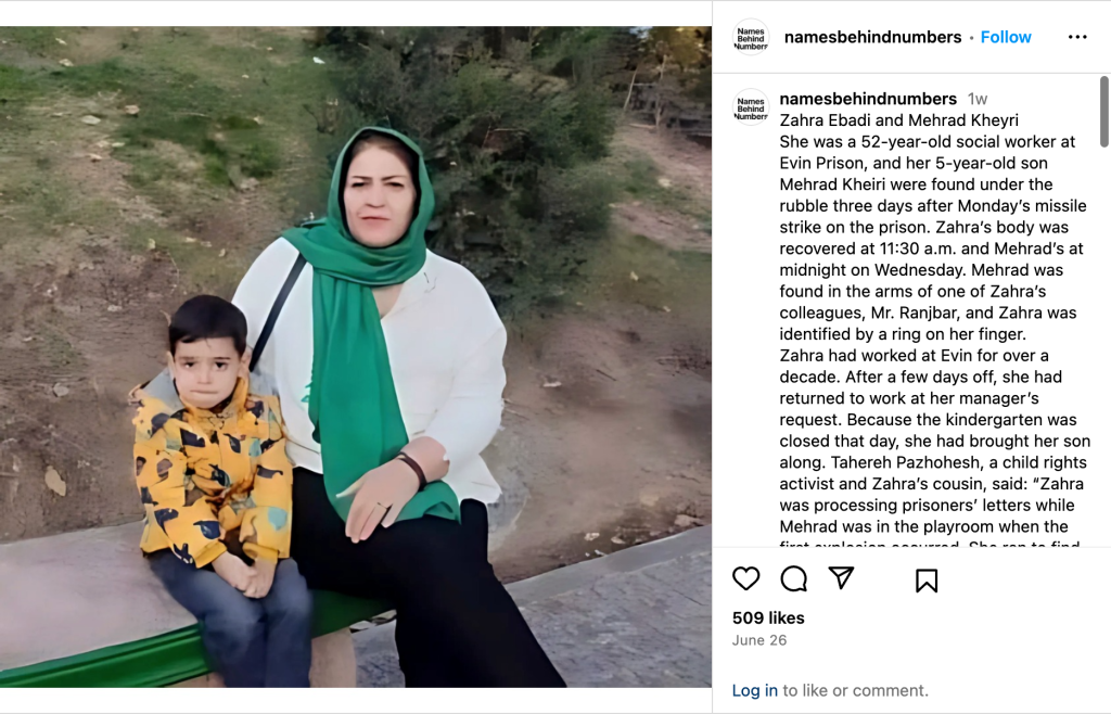 namesbehindnumbers 1wZahra Ebadi and Mehrad KheyriShe was a 52-year-old social worker at Evin Prison, and her 5-year-old son Mehrad Kheiri were found under the rubble three days after Monday’s missile strike on the prison. Zahra’s body was recovered at 11:30 a.m. and Mehrad’s at midnight on Wednesday. Mehrad was found in the arms of one of Zahra’s colleagues, Mr. Ranjbar, and Zahra was identified by a ring on her finger.Zahra had worked at Evin for over a decade. After a few days off, she had returned to work at her manager’s request. Because the kindergarten was closed that day, she had brought her son along. Tahereh Pazhohesh, a child rights activist and Zahra’s cousin, said: “Zahra was processing prisoners’ letters while Mehrad was in the playroom when the first explosion occurred. She ran to find him, but the second blast buried her under the rubble.”At the same time, Mr. Ranjbar, himself the father of a 5-year-old, rushed to protect Mehrad, but a piece of concrete fell on them, killing them both.زهرا عبادی و مهراد خیری زهرا مددکار ۵۲ ساله زندان اوین، و پسر ۵ ساله‌اش مهراد خیری، سه روز پس از حمله موشکی روز دوشنبه، از زیر آوار بیرون کشیده شدند. پیکر مادر ساعت ۱۱:۳۰ صبح و پیکر کودک ساعت ۱۲ شب چهارشنبه پیدا شد. مهراد در آغوش یکی از همکاران زهرا، آقای رنجبر، یافت شد. زهرا را از طریق حلقه‌ای در انگشتش شناسایی کردند.زهرا بیش از ۱۰ سال در زندان اوین کار می‌کرد و پس از چند روز مرخصی، با اصرار مدیرش به محل کار برگشته بود. به دلیل تعطیلی مهدکودک، پسرش را نیز با خود برده بود. طاهره پژوهش، فعال حقوق کودک و دخترخاله زهرا، می‌گوید: «زهرا در حال ثبت نامه‌های زندانیان بود و مهراد در سالن بازی، که انفجار اول رخ داد. او برای پیدا کردن پسرش به سمت سالن دوید که انفجار دوم او را زیر آوار برد.»در همان زمان، آقای رنجبر، که خودش پدر یک کودک ۵ ساله است، تلاش کرد مهراد را نجات دهد، اما تکه‌ای بتن روی سرشان سقوط کرد و هر دو جان باختند#OrdinaryPeople #ZahraEbadi #MehradKheyri#NamesNotNumbers#EveryLifeMatters#FacesOfWar#TheyHadNames#KilledInSilence#CiviliansOfWar#InnocentsOfWar#MothersAndChildren#StoriesNotStatistics#TheHumanCost#WarTookThem#UnheardVoices#RememberTheOrdinary