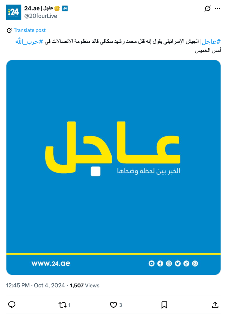 #Urgent | The Israeli army says it killed Mohammad Rashid Skafi, the commander of Hezbollah's communications system, yesterday, Thursday.