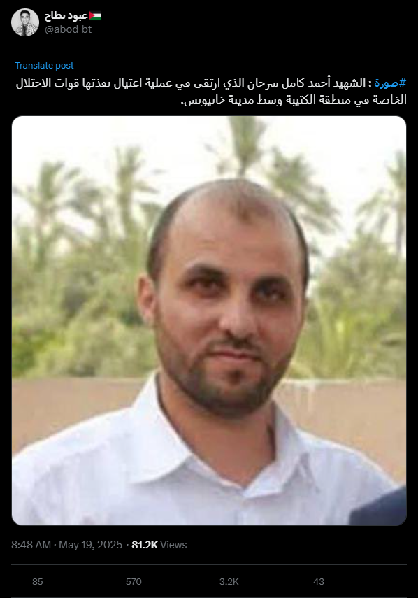 #صورة : الشهيد أحمد كامل سرحان الذي ارتقى في عملية اغتيال نفذتها قوات الاحتلال الخاصة في منطقة الكتيبة وسط مدينة خانيونس.