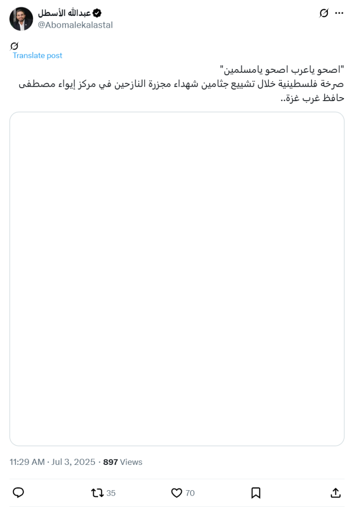 "Wake up, Arabs! Wake up, Muslims!" A Palestinian chant during the funeral procession of the martyrs of the displacement massacre at the Mustafa Hafez shelter in western Gaza.