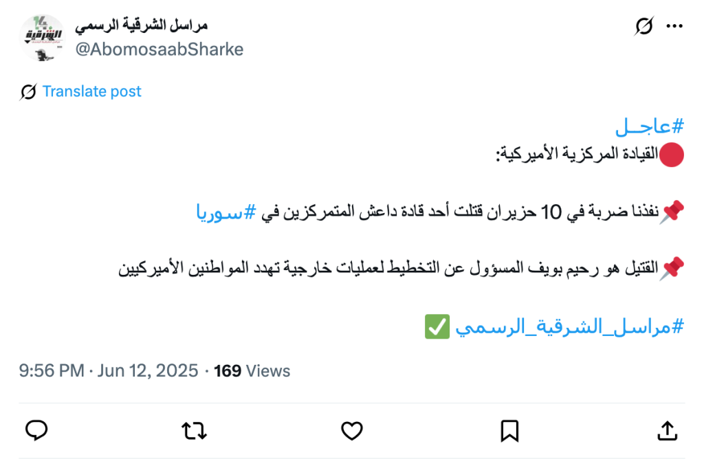 #Urgent US Central Command: We carried out a strike on June 10 that killed an ISIS leader based in #Syria. The dead man was Rahim Boev, responsible for planning external operations that threaten American citizens. #Official_Correspondent_of_Asharq_Al-Awsat